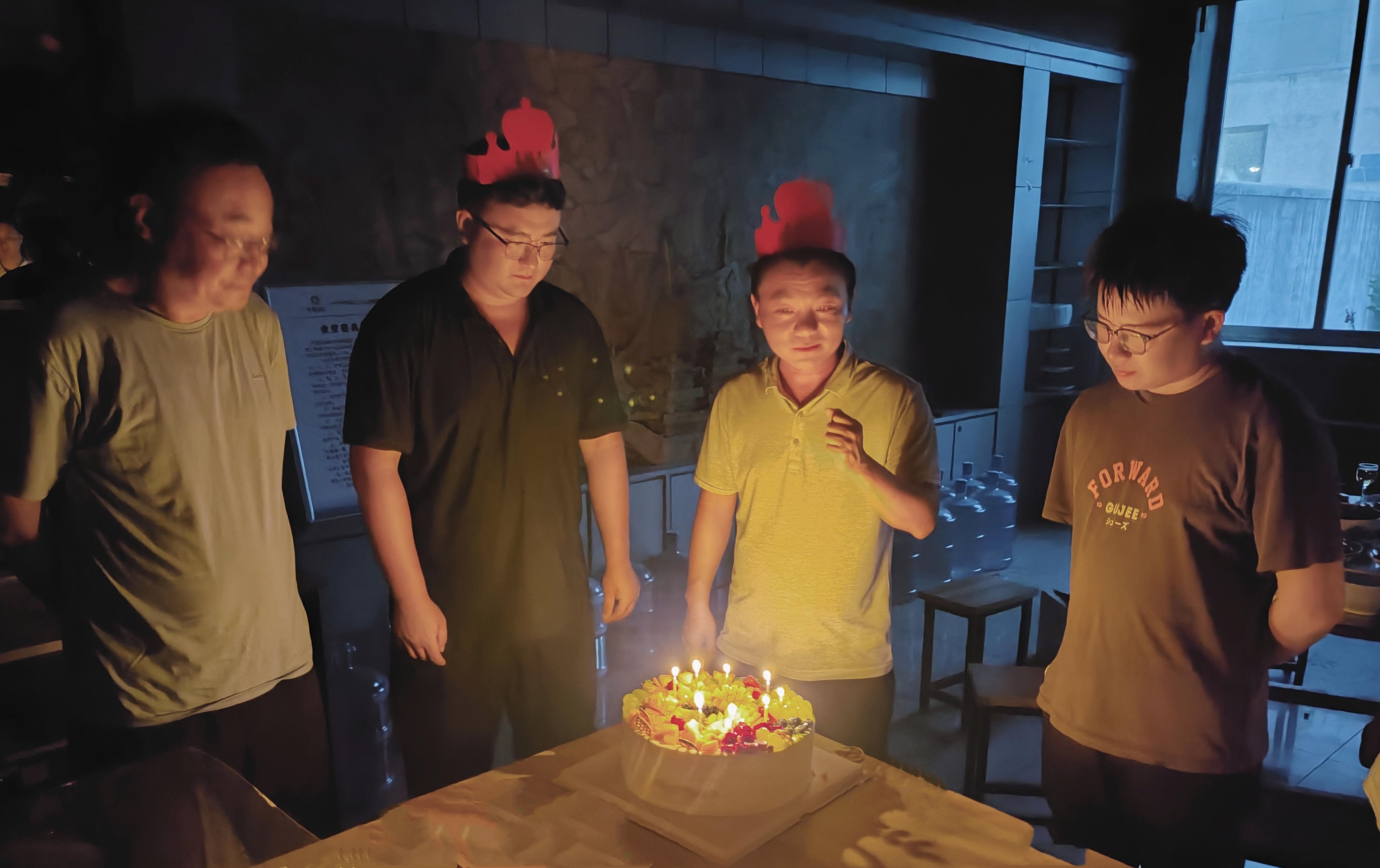 生日會現場布置簡約而溫馨,金色氣球簇擁,暖黃的燈光柔和灑落,營造出“家”一般的溫暖氛圍。精美的定制生日蛋糕和豐富的水果茶點散發著甜蜜的香氣,項目部的員工們暫時放下緊張繁忙的施工任務,齊聚一堂。伴隨著溫暖的生日歌旋律,壽星們在搖曳的燭光前許下心愿,大家共同分享甜蜜的蛋糕,傳遞著濃濃的情誼。